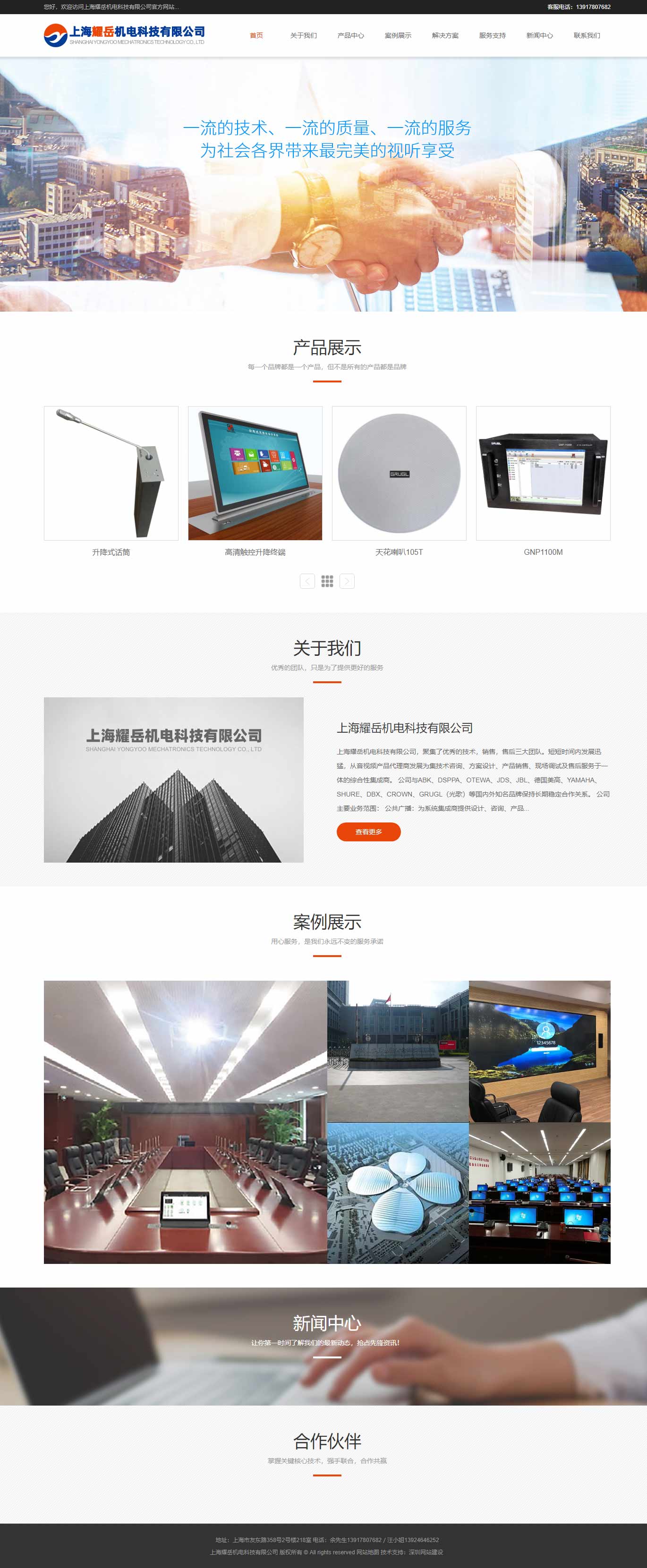 深圳網(wǎng)絡(luò)公司【創(chuàng)絡(luò)】經(jīng)典企業(yè)案例之一,網(wǎng)站簡潔明了,讓客戶可以輕松的訪問網(wǎng)站,這位客戶和深圳網(wǎng)站建設(shè)公司創(chuàng)絡(luò)科技合作之后,項目都獲得了雙方的認可。 上海耀岳機電科技有限公司聚集了優(yōu)秀的技術(shù),銷售,售后三大團隊。短短時間內(nèi)發(fā)展迅猛,從音視頻產(chǎn)品代理商發(fā)展為集技術(shù)咨詢、方案設(shè)計、產(chǎn)品銷售、現(xiàn)場調(diào)試及售后服務(wù)于一體的綜合性集成商。