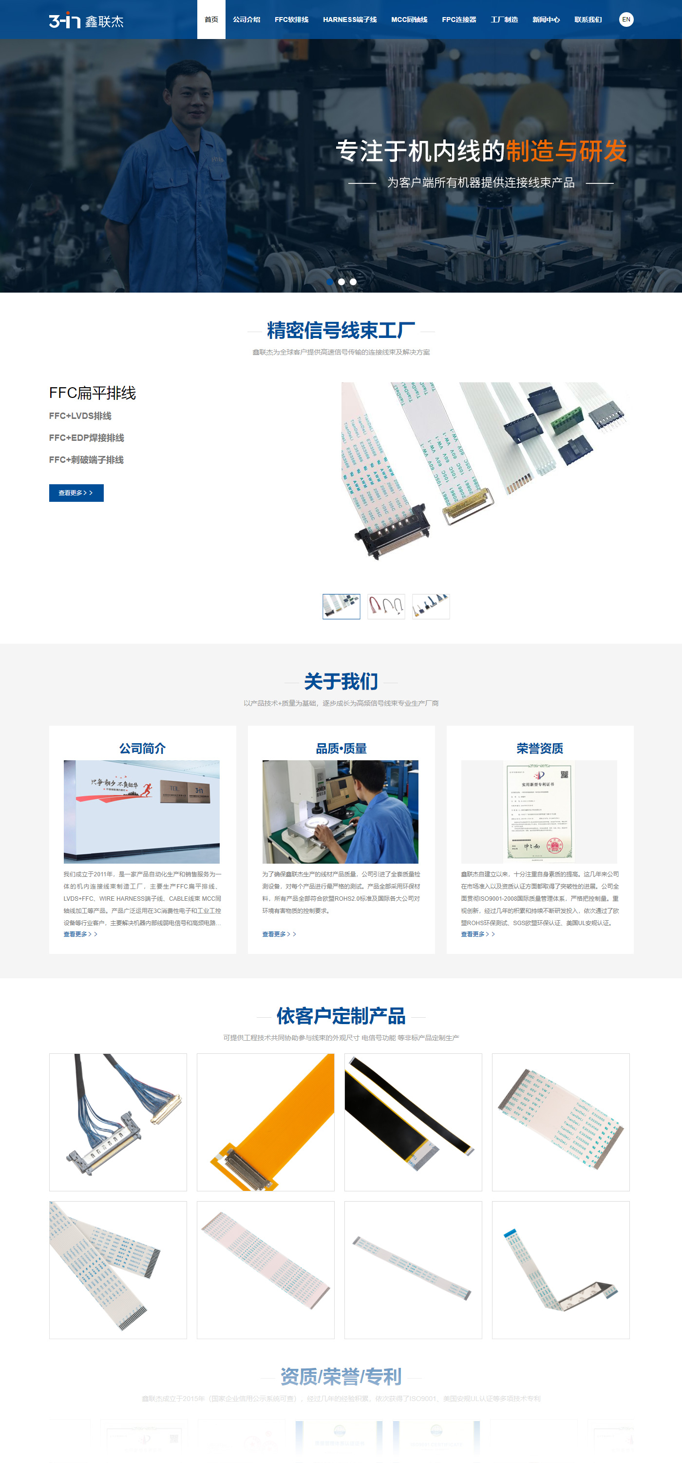 深圳市鑫聯(lián)杰電子科技有限公司是一家產(chǎn)品自動化生產(chǎn)和銷售服務(wù)為一體的機(jī)內(nèi)連接線束制造工廠,主要生產(chǎn)FFC扁平排線、LVDS+FFC、WIRE HARNESS端子線、CABLE線束 MCC同軸線加工等產(chǎn)品。產(chǎn)品廣泛運(yùn)用在3C消費(fèi)性電子和工業(yè)工控設(shè)備等行業(yè)客戶,主要解決機(jī)器內(nèi)部線弱電信號和高頻電路信號的傳輸。工廠已全面執(zhí)行ISO9001-2015國際質(zhì)量管理體系,把控制過程質(zhì)量嚴(yán)格貫徹于生產(chǎn)的每一個(gè)工序中。