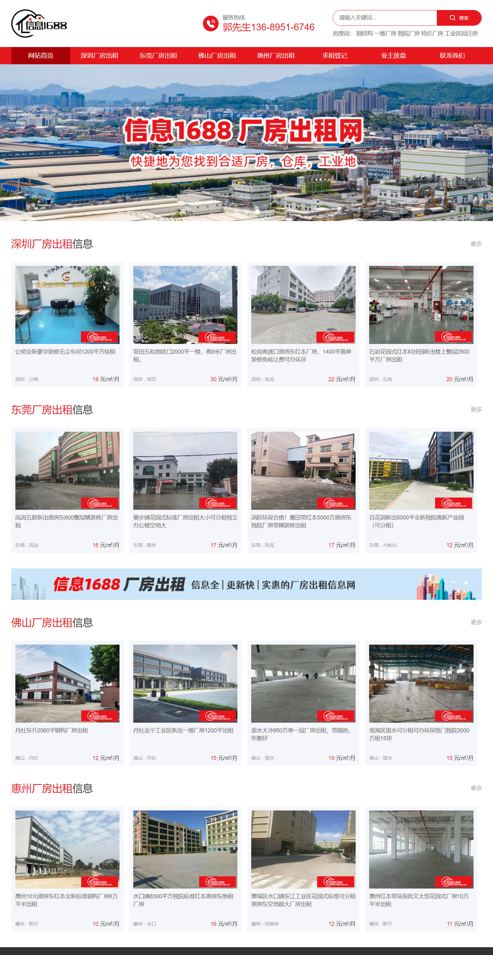 深圳廠房信息網(wǎng)站采用紅色風(fēng)格,頁面十分清晰簡潔,客戶一覽就可以看到所需地區(qū)得廠房,而且廠房信息量十分大。并采用三合一的網(wǎng)站建設(shè)風(fēng)格。